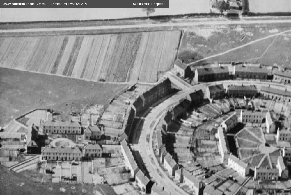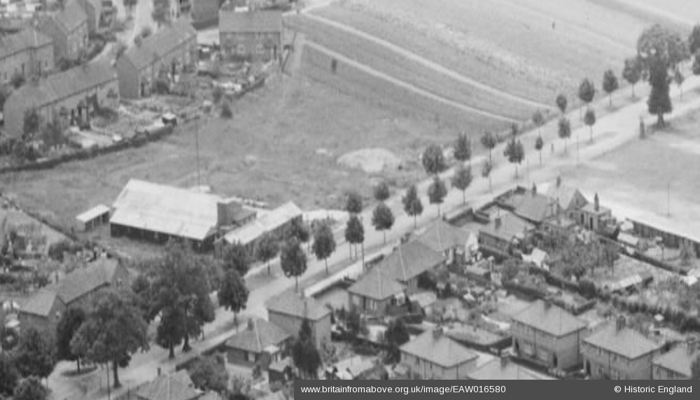 Arthur’s home is in the top left and his smallholding can be seen middle to top right. That might even be Fungi tending to his vegetables to the top-right. The tree-lined road running diagonally across the image is Boundary Road and B&Q now sits on the land to the right.