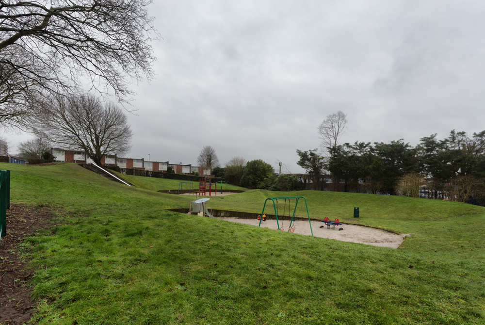 That said there are still a few little hints to the site’s past if you know where to look, none more so than at the odd-shaped park that was built on the piece of land what used to be known as “Fungi’s Pit”. The pit was a pond created somewhat accidentally by the remnants of an former chalk or gravel working that predates the estate and Fungi’s farm by some time. This man-made depression had slowly filled with water over the years and was often referred to as a “pond” on maps throughout the years, although I think the word “pond” may make it sound a little more romantic than the reality of it essentially just being a stinky old pit. This pit or pond may or may not have been a source of water for the smallholding over the years but it also seemed to be a place where unwanted stuff may have been dumped, including – if some of the local children were to be believed – pig’s blood, dead animals and all-sorts of rubbish.