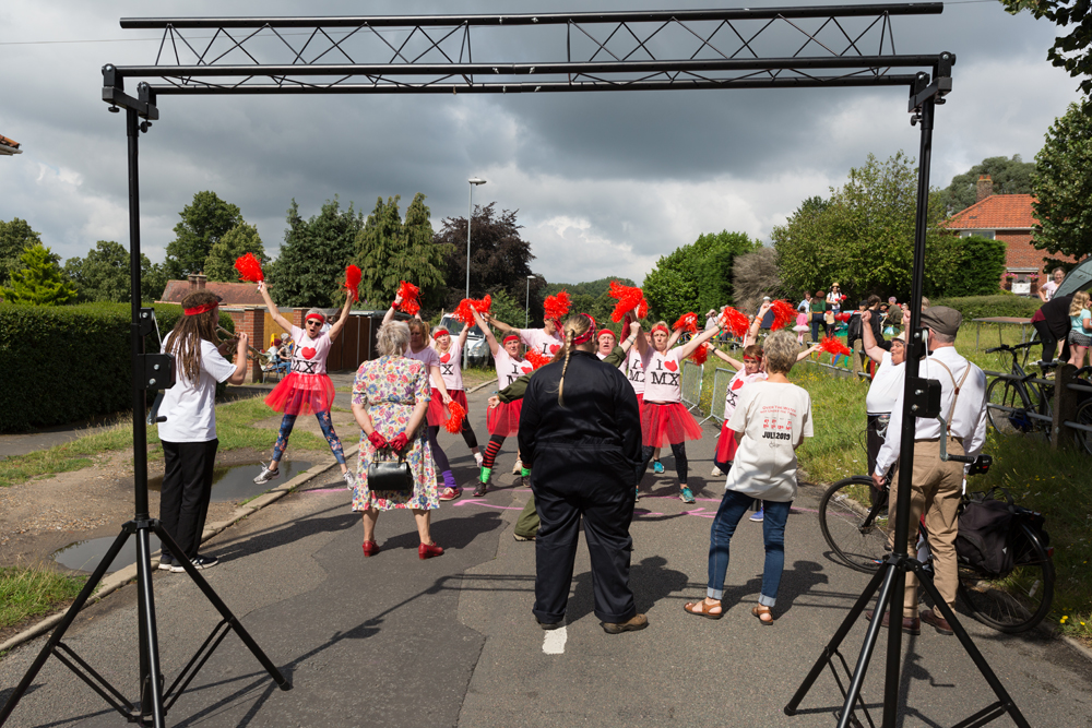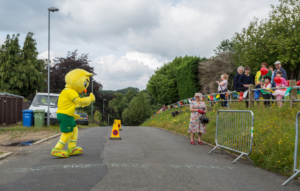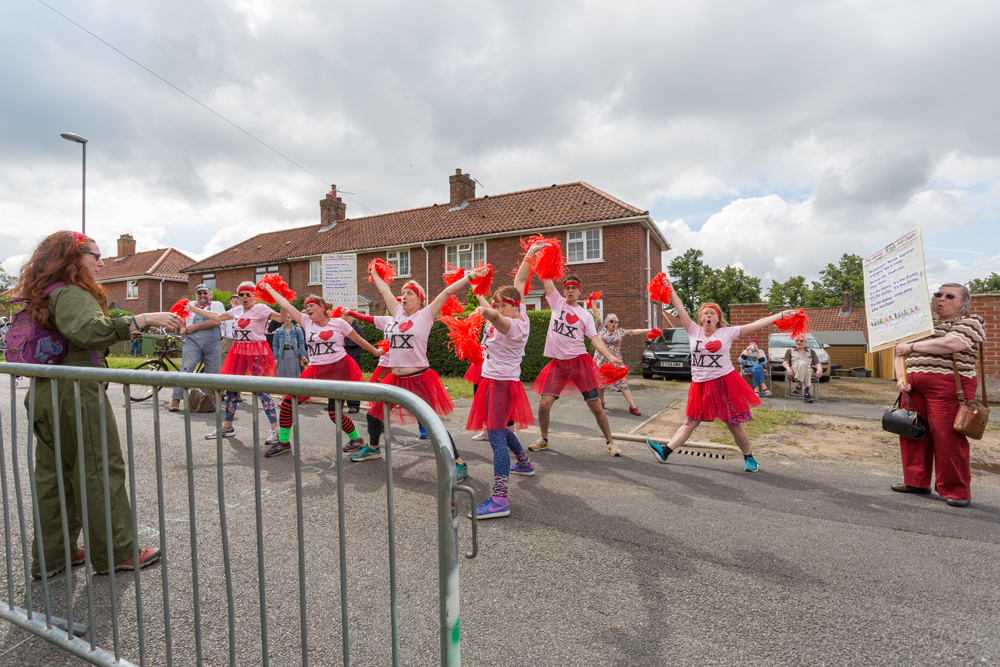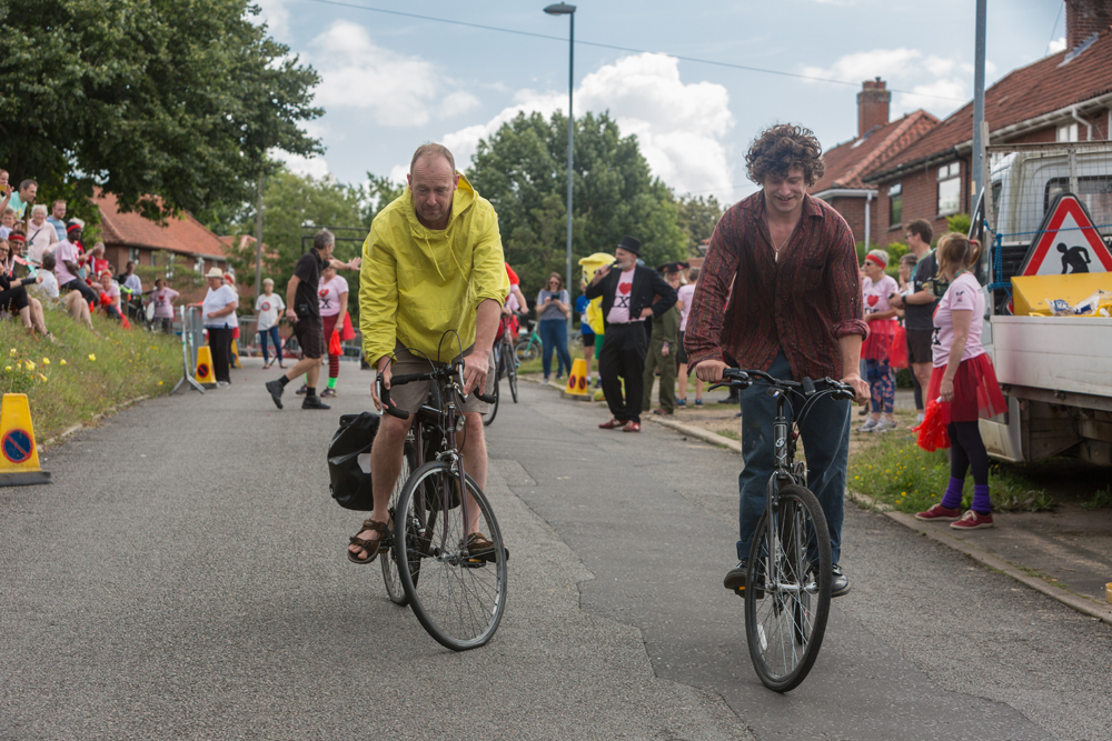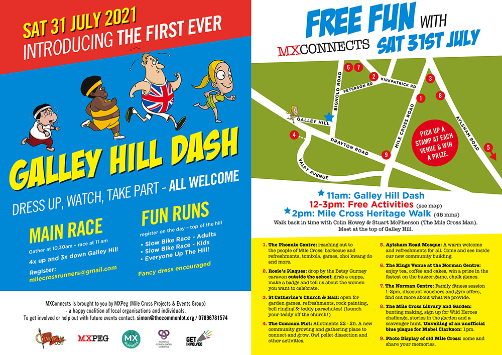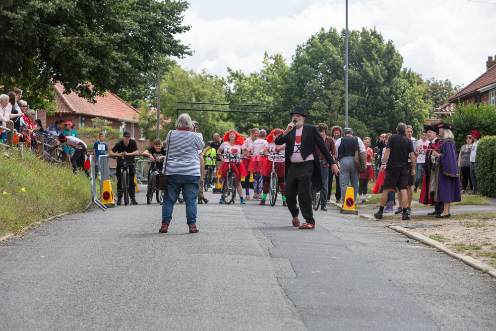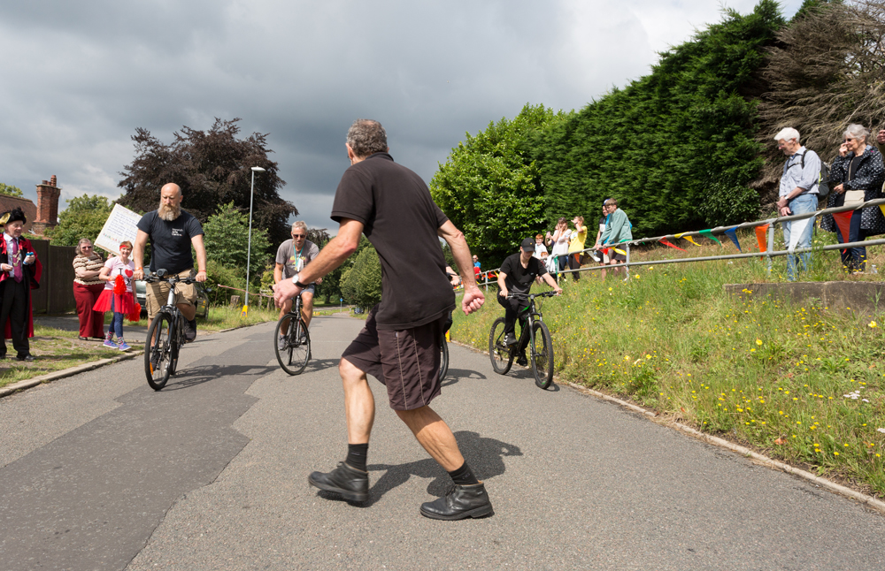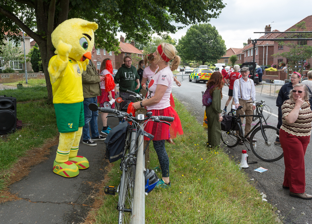 From 11am the Galley Hill was closed to traffic so that the first annual ‘Galley Hill Dash’ and the preparations for it could happen. In the hour or so before the races started it was a lovely to have a brief spell car-free tranquillity on the hill, as over the years it has increasingly become part of a rat-run for motorists trying to avoid the now constantly choked-up Drayton Road Roundabout. As the noise of speeding cars was replaced with laughter, chatter and song, the locals slowly began emerging from their homes and began to gather on the green or in nearby gardens (I spotted the old Mile Cross Milkman, Jack and his wife had even made their way up the hill) and the atmosphere began to pick up, helped along by The Common Lot’s Simon Floyd on the mic, the Galley Hill dancers and somewhat bizarrely a late arrival in the form of Captain Canary. The crowd wasn’t as large as we were hoping for, but for a first event of this kind it wasn’t a wash-out by any means and it’s traditionally hard to get Mile Cross to come out of its shell. That said, it had attracted locals and it was nice to see a crowd of smiling faces gathered around Galley Hill for the Galley Hill Dash and the following events.