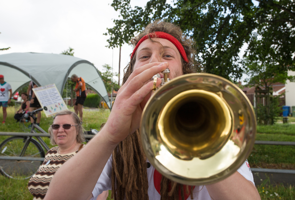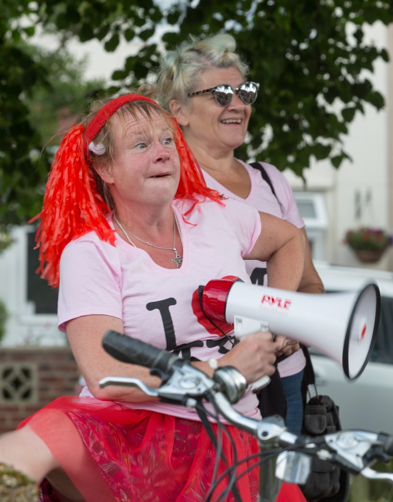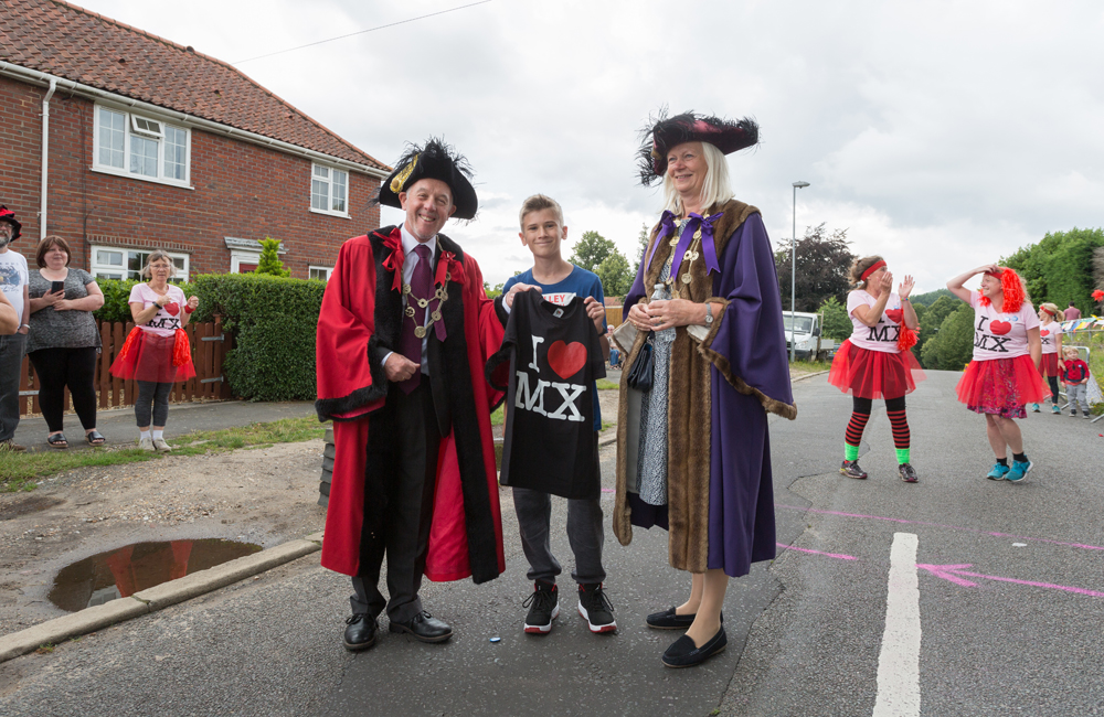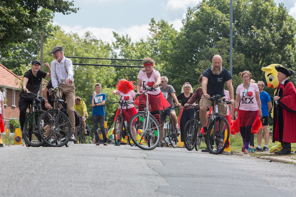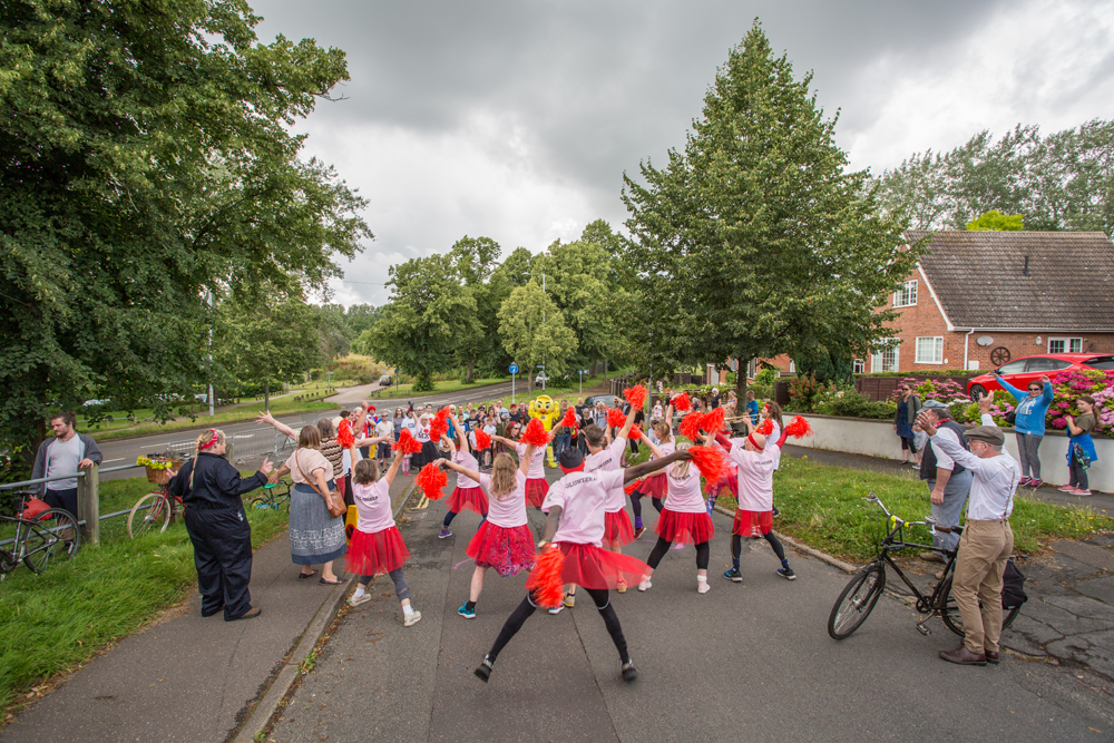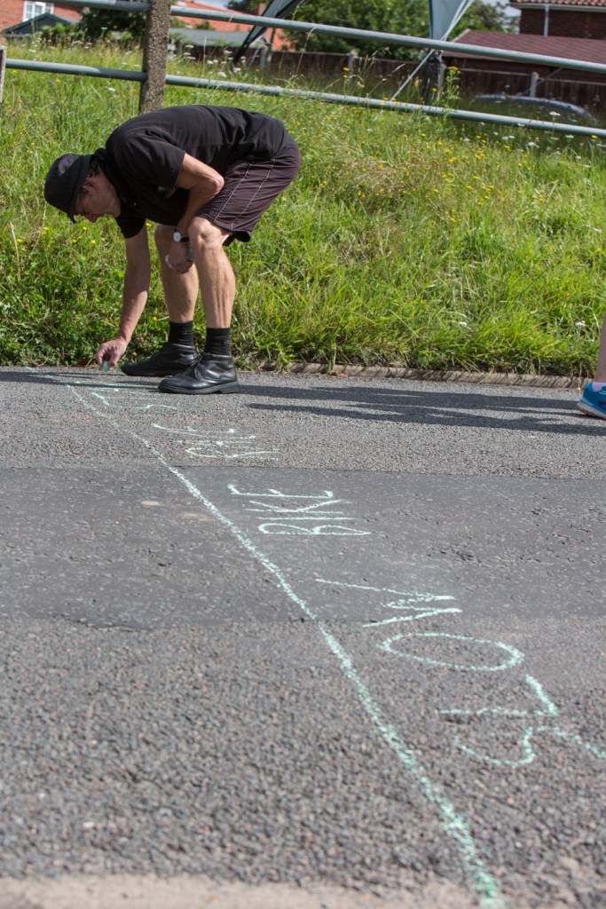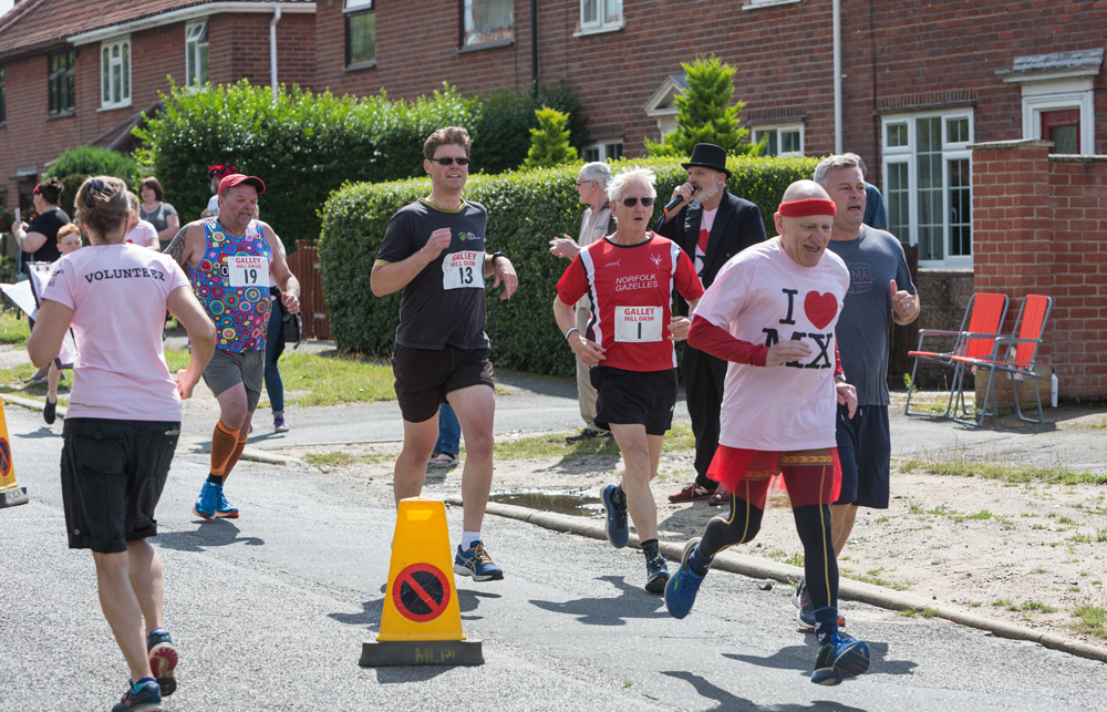 From 11am the Galley Hill was closed to traffic so that the first annual ‘Galley Hill Dash’ and the preparations for it could happen. In the hour or so before the races started it was a lovely to have a brief spell car-free tranquillity on the hill, as over the years it has increasingly become part of a rat-run for motorists trying to avoid the now constantly choked-up Drayton Road Roundabout. As the noise of speeding cars was replaced with laughter, chatter and song, the locals slowly began emerging from their homes and began to gather on the green or in nearby gardens (I spotted the old Mile Cross Milkman, Jack and his wife had even made their way up the hill) and the atmosphere began to pick up, helped along by The Common Lot’s Simon Floyd on the mic, the Galley Hill dancers and somewhat bizarrely a late arrival in the form of Captain Canary. The crowd wasn’t as large as we were hoping for, but for a first event of this kind it wasn’t a wash-out by any means and it’s traditionally hard to get Mile Cross to come out of its shell. That said, it had attracted locals and it was nice to see a crowd of smiling faces gathered around Galley Hill for the Galley Hill Dash and the following events.