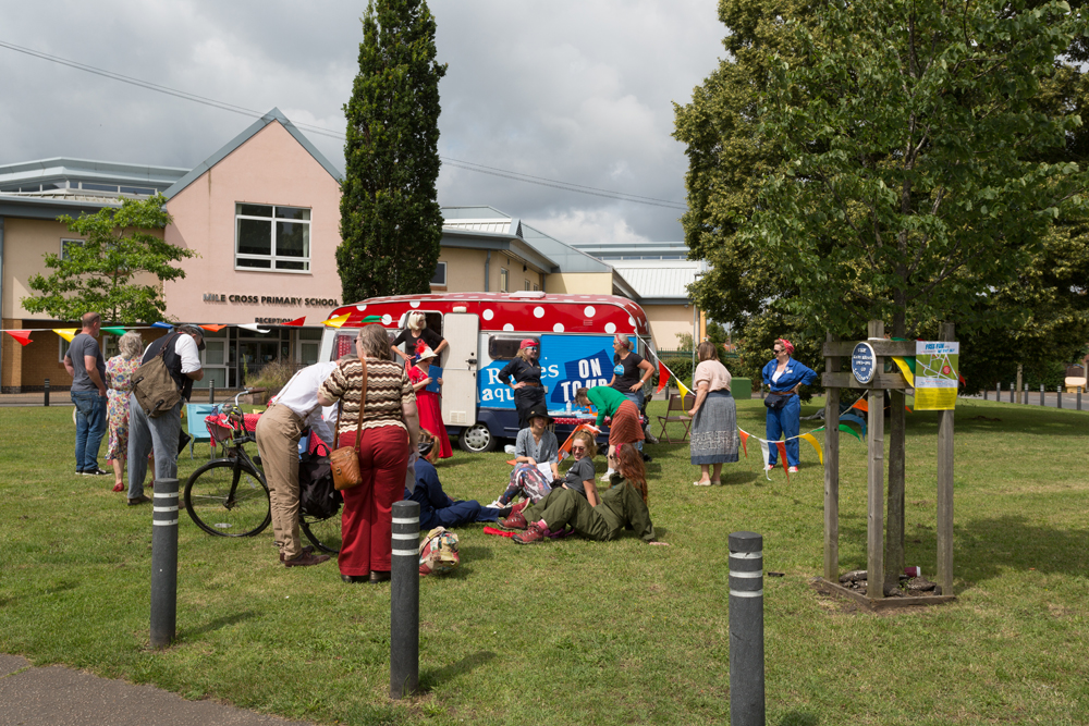 At 2pm there was also planned to be a fairly short, 45-minute Heritage Walk through the estate led by myself and Colin Howey, one of the founding members of the popular historical ‘Magdalen Walks’. Our walk was to begin from the green at the top of Galley Hill and end at the parade of shops on Drayton Road where their was a pop-up shop dedicated to Mile Cross memories, including a selection of old photographs of the estate on display, meant to inspire conversation amongst any of the Mile Cross Residents who ventured in, or peered through the window photo display.