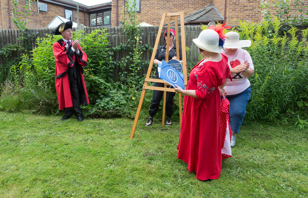 Chrissie unveils the plaque to Mabel in the garden of the library as the current Mayor of Norwich applauds.